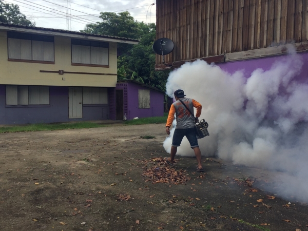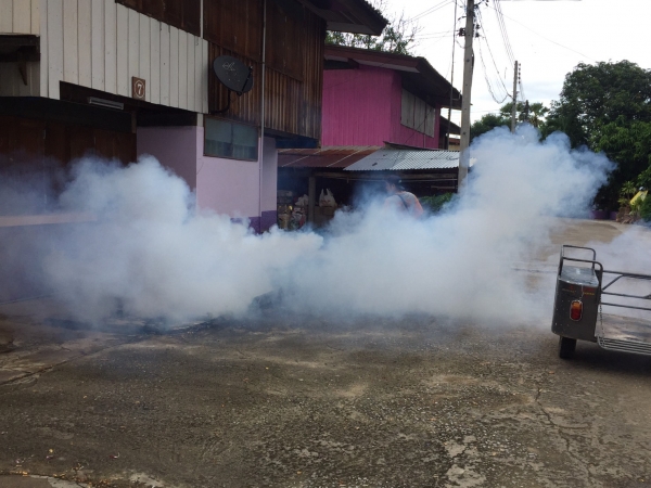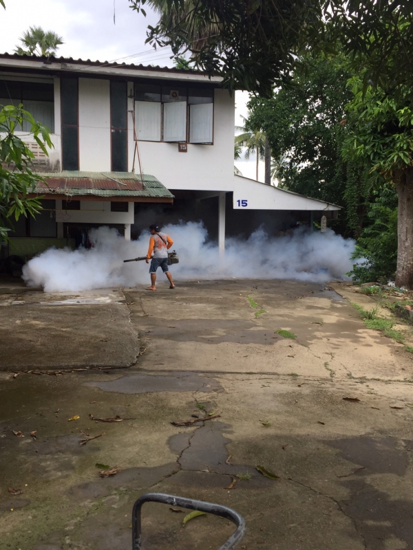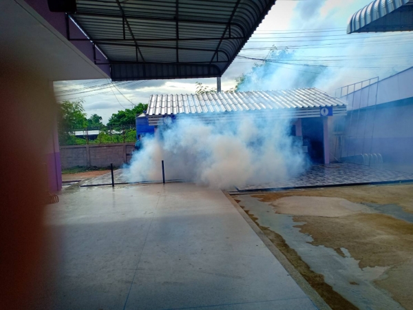 กองสาธารณสุขและสิ่งแวดล้อม ดำเนินการฉีดพ่นหมอกควันเพื่อป้องกันโรคไข้เลือดออก บริเวณโรงเรียนบ้านลาดวิทยา