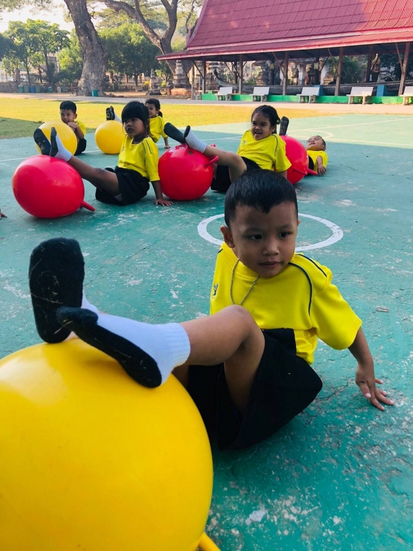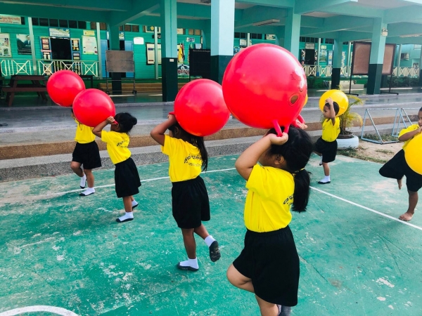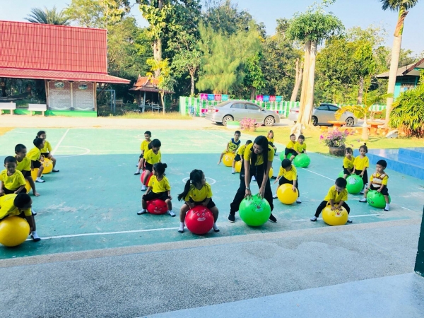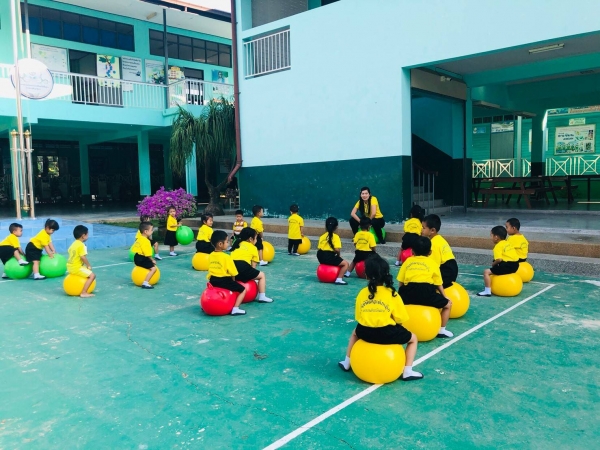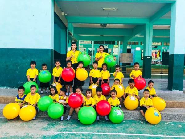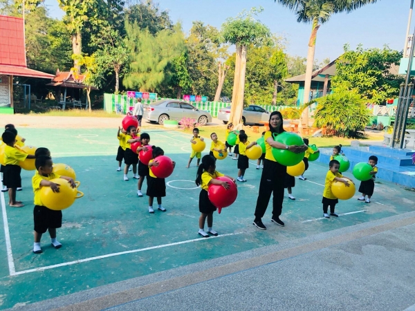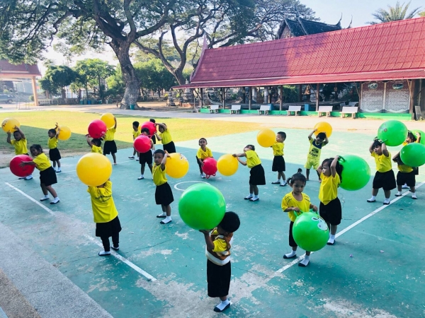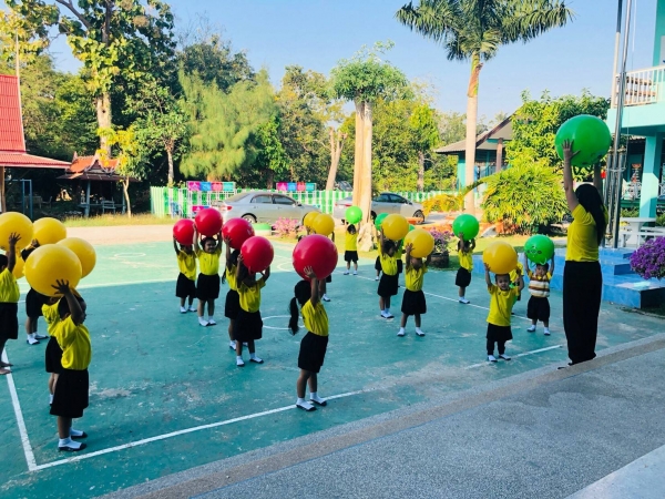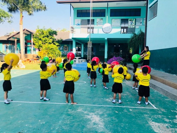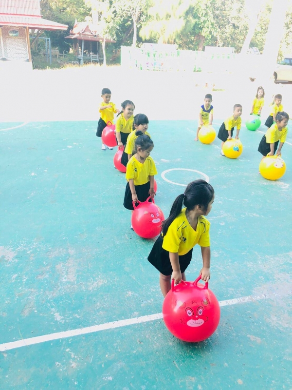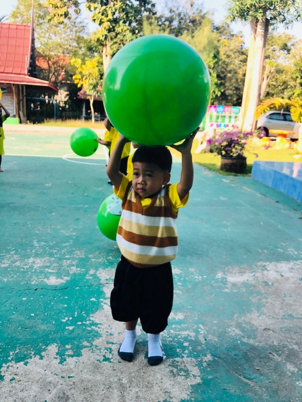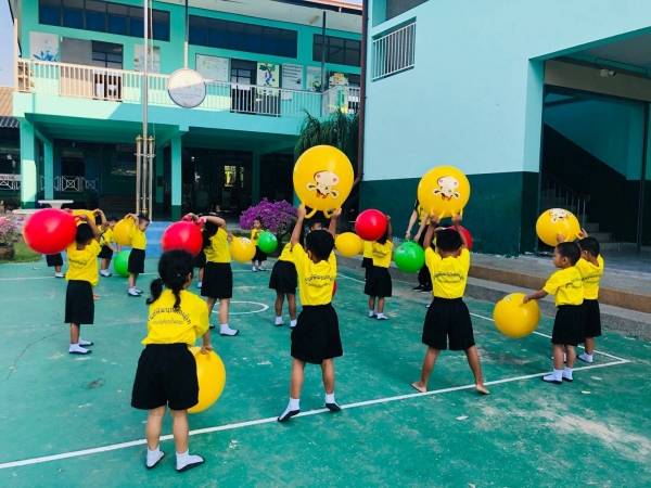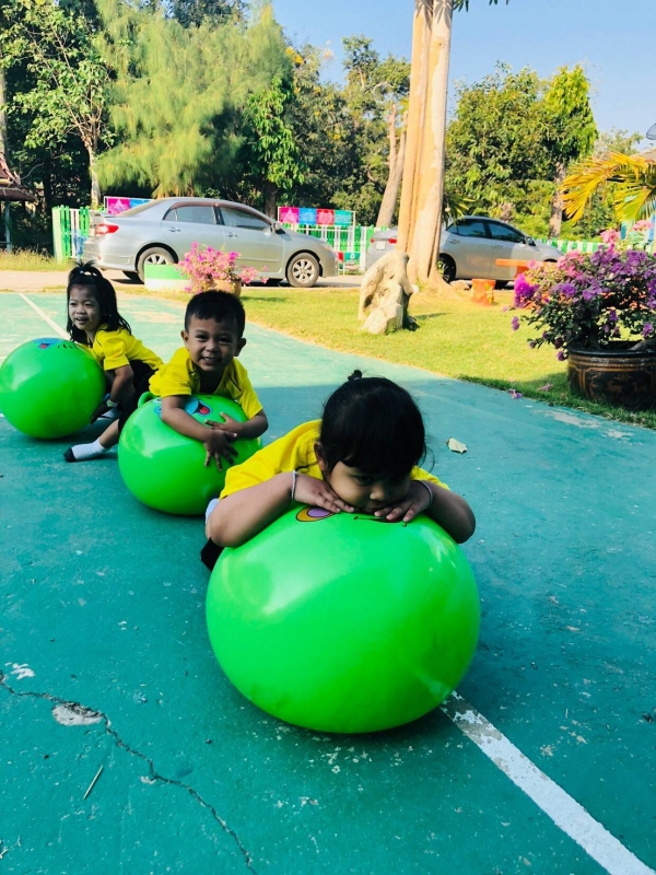 กิจกรรมกลางแจ้ง (สนุกกับบอลยักษ์) เพื่อเสริมสร้างพัฒนาการด้านร่างกาย สมอง ความสัมพันธ์ระหว่างมือ ตา ฝึกทักษะการควบคุมการเคลื่อนไหวของอวัยวะทุกส่วน โดยเฉพาะกล้ามเนื้อมัดใหญ่ เช่น แขน ขา และลำตัว