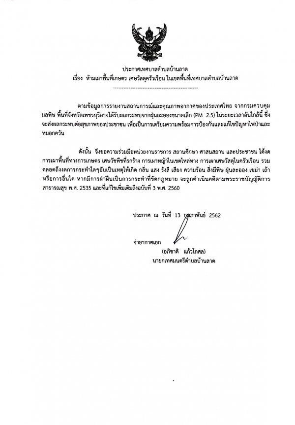 ห้ามเผาพื้นที่เกษตร เศษวัสดุครัวเรือน ในเขตพื้นที่เทศบาลตำบลบ้านลาด