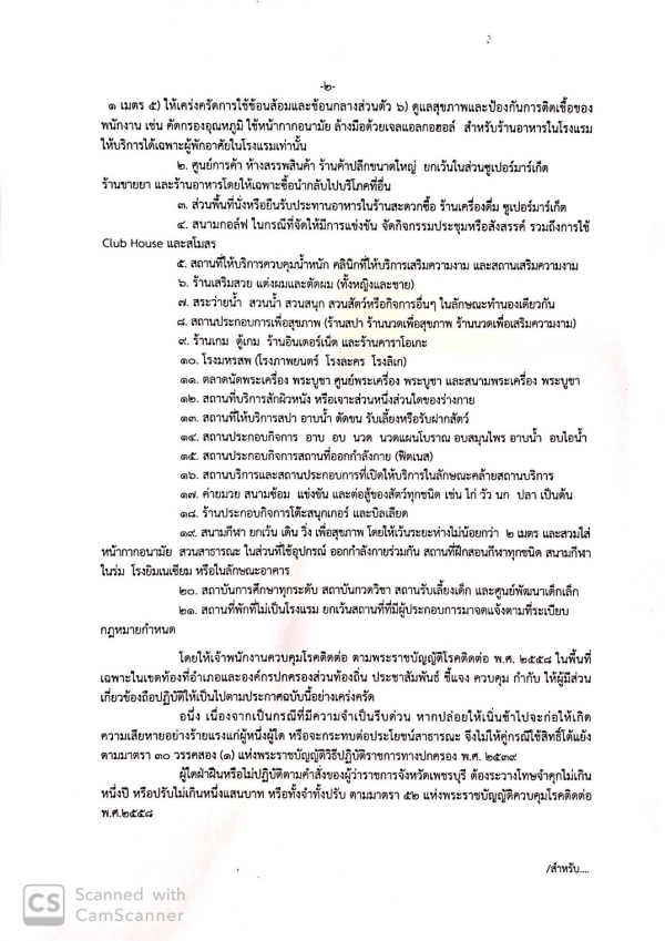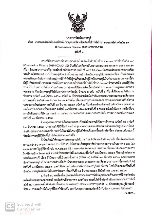 ประกาศจังหวัดเพชรบุรี เรื่อง มาตรการเร่งด่วนในการป้องกันวิกฤตการณ์จากโรคติดเชื้อไวรัสโคโรนา 2019 หรือโรคโควิด 19 (ฉบับที่ 6)
