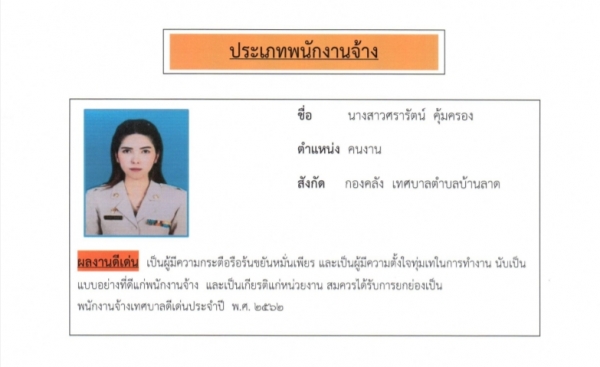 เทศบาลบ้านลาด ได้ดำเนินการคัดเลือกพนังานดีเด่น ประจำปี 2562 เพื่อเป็นการส่งเสริมและพัฒนาให้พนักงานมีความประพฤติตนเป็นแบบอย่างที่ดี และอุทิศตนเพื่อท้องถิ่นและองค์กร มีคุณธรรม จริยธรรม และมีความซื่อสัตย์เป็นที่ประจักษ์ อีกทั้ง เป็นการสร้างขวัญและกำลังใจให้แก่บุคลากร โดยได้คัดเลือก พนักงานเทศบาล ลูกจ้างประจำ และพนักงานจ้าง ดังนี้ เป้นพนักงานดีเด่น ประจำปี พ.ศ. 2562