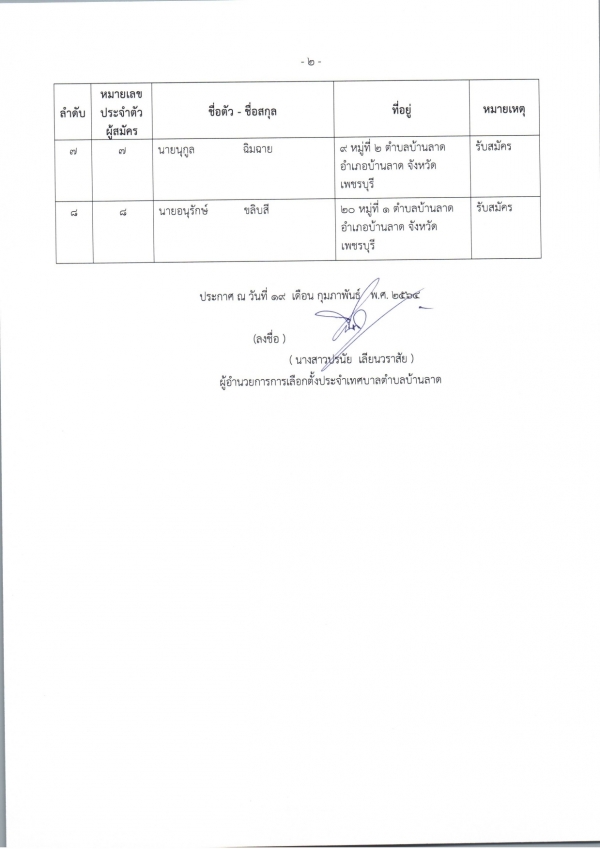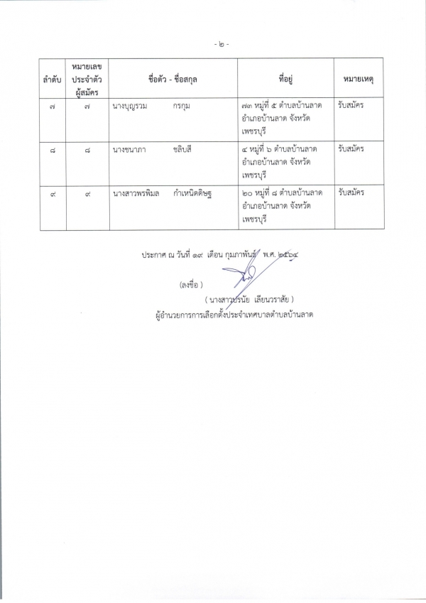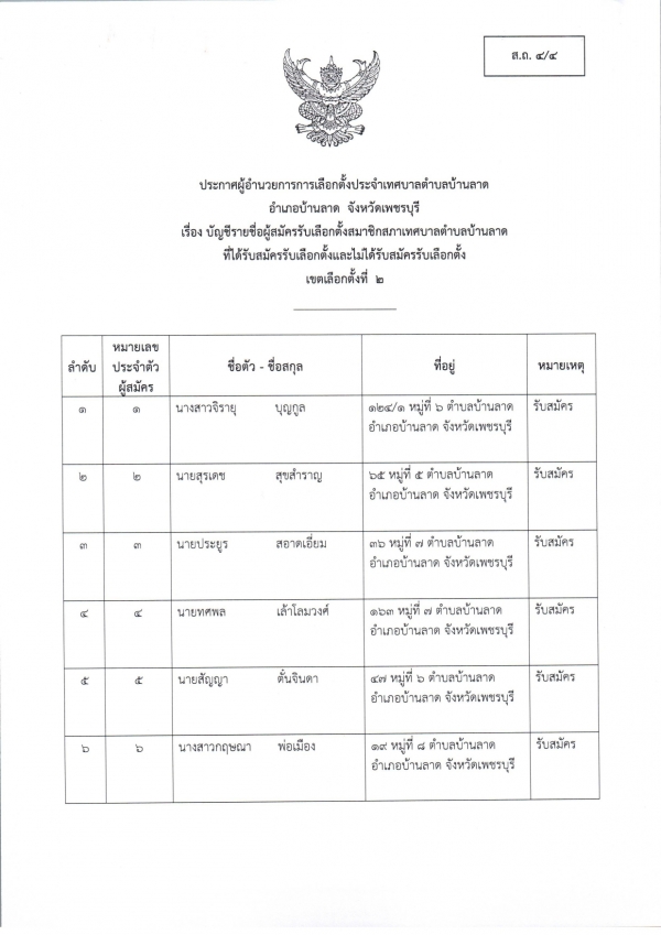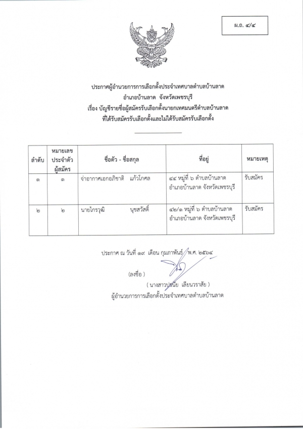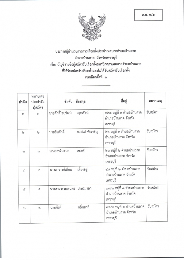 ประกาศบัญชีรายชื่อผู้สมัครรับเลือกตั้ง สมาชิกสภาเทศบาลตำบลบ้านลาด และ นายกเทศมนตรีตำบลบ้านลาด ที่รับสมัครและไม่รับสมัครรับเลือกตั้ง (ส.ถ./ผ.ถ. 4/4)