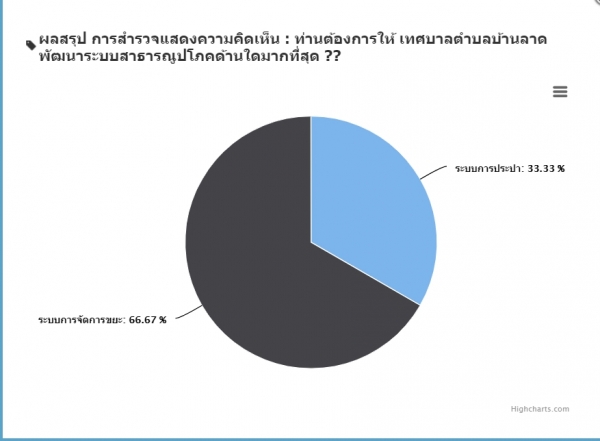 2. ความต้องการให้เทศบาลตำบลบ้านลาดพัฒนาระบบสาธารณูปโภคด้านใดมากที่สุด ผลปรากฏ ระบบจัดการขยะ 66.67% ระบบประปา 33.33%