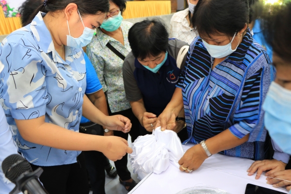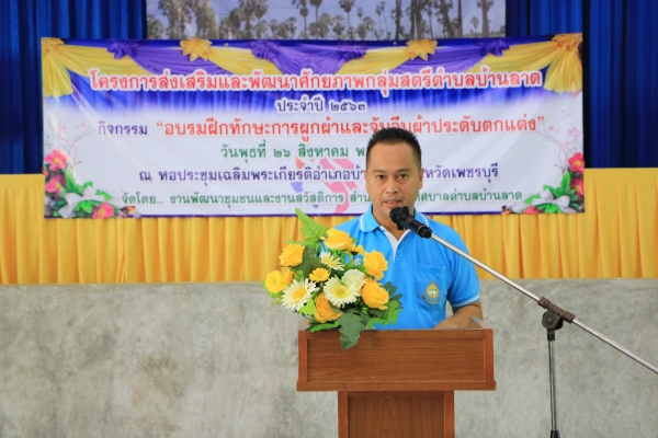 ***งานพัฒนาชุมชนและงานสวัสดิการ สำนักปลัด เทศบาลตำบลบ้านลาด ได้จัดทำโครงการส่งเสริมและพัฒนาศักยภาพกลุ่มสตรีตำบลบ้านลาด ประจำปี 2563 กิจกรรม "อบรมฝึกทักษะการผูกผ้าและจับจีบผ้าประดับตกแต่ง" มีวัตถุประสงค์เพื่อเป็นการฝึกอบรมอาชีพระยะสั้น ส่งเสริมทักษะด้านอาชีพ ให้มีแนวทางปฏิบัติที่ถูกต้อง ส่งเสริมการรวมกลุ่มให้เกิดการเรียนรู้ สามารถพึ่งพาตนเองและเพิ่มรายได้ และเป็นการใช้เวลาว่างให้เกิดประโยชน์ในลักษณะการรวมกลุ่มเป็นการร่วมกันคิด ร่วมกันทำ และร่วมกันพัฒนา ก่อให้เกิดความรักความสามัคคีในชุมชน มีกลุ่มเป้าหมายที่เข้าร่วมโครงการจำนวน 52 คน โดยจัดขึ้นเมื่อวันที่ 26 สิงหาคม 2563 ณ หอประชุมเฉลิมพระเกียรติอำเภอบ้านลาด จังหวัดเพชรบุรี