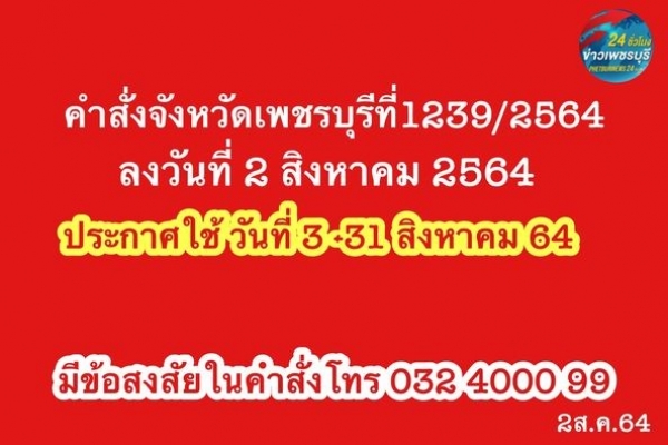 คำสั่งเพชรบุรี ที่ 1239/2564 เรื่องการยกระดับมาตรการและป้องกันควบคุมการแพร่ระบาดของเชื้อไวรัสโคโรนา