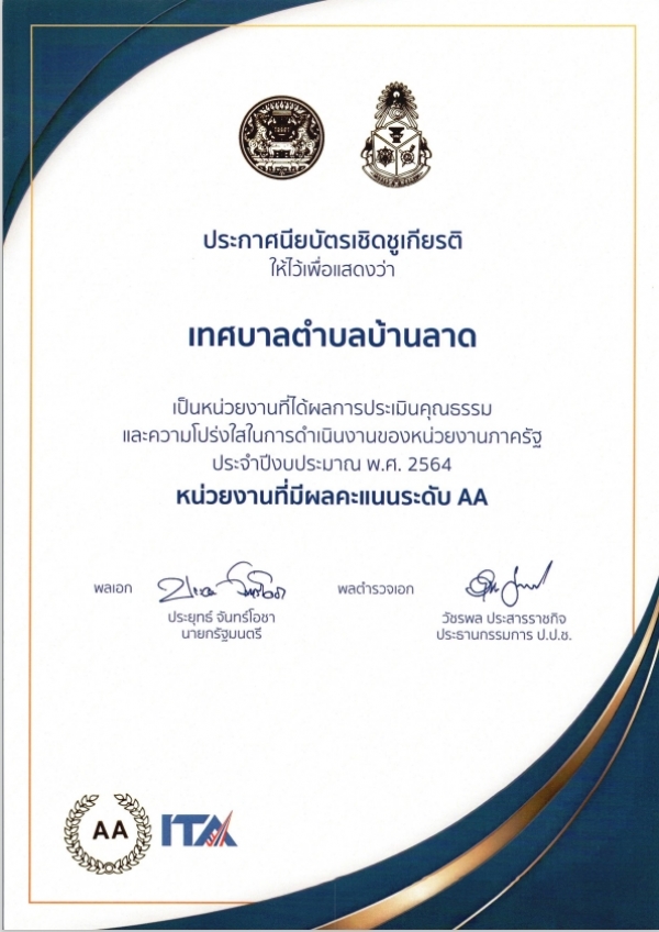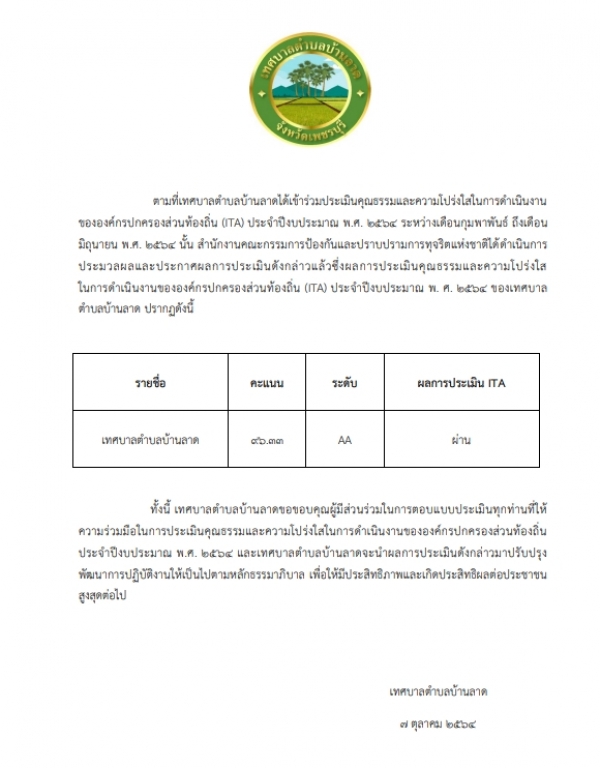 ตามที่เทศบาลตำบลบ้านลาดได้เข้าร่วมประเมินคุณธรรมและความโปร่งใสในการดำเนินงานขององค์กรปกครองส่วนท้องถิ่น (ITA) ประจำปีงบประมาณ พ.ศ. 2564 ระหว่างเดือนกุมพาพันธ์ ถึงเดือนมิถุนายน พ.ศ. 2564 นั้น สำนักงานคณะกรรมการป้องกันและปราบปรามการทุจริตแห่งชาติได้ดำเนินการประมวลผลและประกาศผลการประเมินดังกล่าวแล้วซึ่งผลการประเมินคุณธรรมและความโปร่งใสในการดำเนินงานขององค์กรปกครองส่วนท้องถิ่น (ITA) ประจำปีงบประมาณ พ. ศ. 2564 ของเทศบาลตำบลบ้านลาด โดยเป็นหน่วยงานที่มีผลคะแนนระดับ AA (96.33 คะแนน) ผ่านการประเมิน