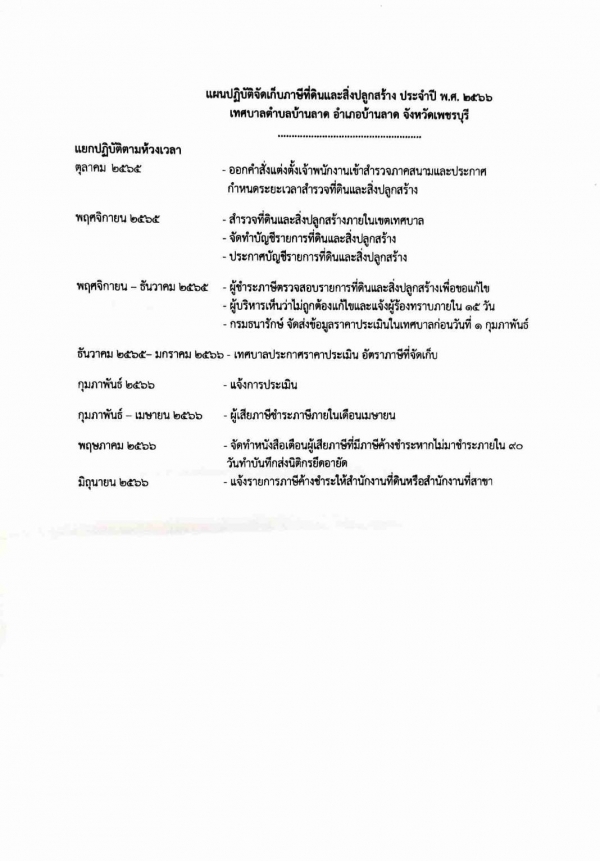 ด้วยเทศบาลตำบลบ้านลาด ได้ดำเนินการจัดทำแผนการจัดเก็บภาษี ประจำปี 2566 โดยอาศัยอำนาจตามพระราชบัญญัติภาษีที่ดินและสิ่งปลูกสร้าง พ.ศ.2562 และพระราชบัญญัติภาษีป้าย พ.ศ.2510 เพื่อเป็นการเพิ่มประสิทธิภาพการปฏิบัติงานด้านการจัดเก็บภาษีและเร่งรัดการจัดเก็บภาษีของเทศบาลตำบลบ้านลาด จึงได้กำหนดแผนการจัดเก็บรายได้ ประจำปี 2566 ตามเอกสารแนบท้ายประกาศนี้