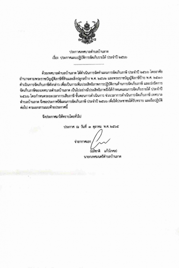 ประกาศเทศบาลตำบลบ้านลาด เรื่อง ประกาศแผนปฏิบัติการจัดเก็บรายได้ ประจำปี 2566