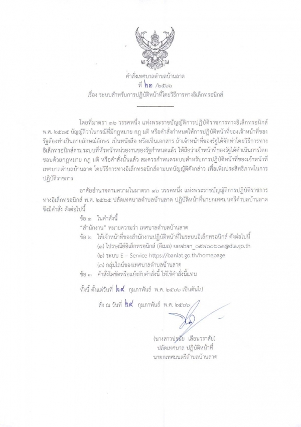 พระราชบัญญัติการปฏิบัติราชการทางอิเล็กทรอนิกส์ พ.ศ. 2566 ได้กำหนดให้ หน่วยงานของรัฐกำหนดช่องทางอิเล็กทรอนิกส์สำหรับให้ประชาชนยื่นคำชขอหรือติดต่อหน่วยงาน เพื่อเป้นการอำนวยความสะดวกและลดภาระแก่ประชาชน เพิ่มประสิทธิภาพในการปฏิบัติราชการ เทศบาลตำบลบ้านลาดจึงได้กำหนดช่องทางอิเล็กทรอนิกส์สำหรับให้ประชาชน ตามมาตรา 10 วรรคหนึ่ง มาตรา 13 (1) และมาตรา 16 วรรคหนึ่ง แห่งพระราชบัญญัติการปฏิบัติราชการทางอเล็กทรอนิกส์ พ.ศ. 2565 และประกาศให้ประชาชนในพื้นที่ตำบลบ้านลาดทราบ และถือปฏิบัติต่อไป