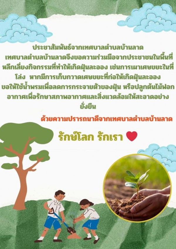 เทศบาลตำบลบ้านลาดจึงขอความร่วมมือจากประชาชนในพื้นที่ หลีกเลี่ยงกิจกรรมที่ทำให้เกิดฝุ่นละออง เช่น การเผาเศษขยะในที่โล่ง หากมีการเก็บกวาดเศษขยะที่ก่อให้เกิดฝุ่นละอองขอให้ใช้น้ำพรม เพื่อลดการกระจายตัวของฝุ่น หรือปลูกต้นไม้ฟอกอากาศเพื่อรักษาสภาพอากาศและสิ่งแวดล้อมให้สะอาดอย่างยั่งยืน ด้วยความปรารถนาดีจาก เทศบาลตำบลบ้านลาด ขอบคุณค่ะ