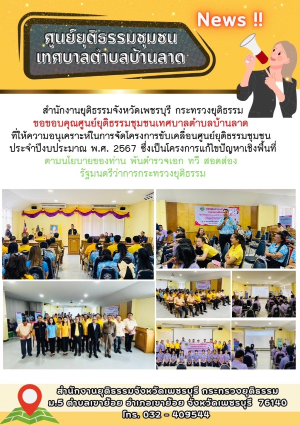 ศูนย์ยุติธรรมชุมชนเทศบาลตำบลบ้านลาด ร่วมกับ สำนักงานยุติธรรมจังหวัดเพชรบุรี ได้จัด "กิจกรรมการแก้ไขปัญหาการขาดความรู้กฎหมาย กฎหมายน่ารู้สู่ประชาชน และสิทธิการเข้าถึงกระบวนการยุติธรรม" เพื่อให้ประชาชนในพื้นที่ตำบลบ้านลาด มีความรู้ความเข้าใจในการแก้ไขปัญหาอันเกิดจากถูกเอาเปรียบด้านกฎหมาย และตระหนักรู้เท่าทันในสิทธิการเข้าถึงกระบวนการยุติธรรม เพื่อนำไปสู่การแก้ปัญหาอย่างยั่งยืนอันจะไปสู่การสร้างความสงบสุขในชุมชน ณ ชั้น 3 สำนักงานเทศบาลตำบลบ้านลาด อำเภอบ้านลาด จังหวัดเพชรบุรี โดยได้รับความร่วมมือจาก ผู้แทนของสำนักงานคณะกรรมการกำกับและส่งเสริมการประกอบธุรกิจประกันภัย (คปภ.) จังหวัดเพชรบุรี ผู้แทนจากสถานีตำรวจภูธรบ้านลาด และเจ้าหน้าที่ของสำนักงานยุติธรรมจังหวัดเพชรบุรี ร่วมเป็นวิทยากรบรรยายให้ความรู้ด้านกฎหมายในเรื่องของการทำประกันภัยภาคบังคับ การป้องกันปัญหามิจฉาชีพออนไลน์ และการเข้าถึงสิทธิในกระบวนการยุติธรรม โดยมีกลุ่มเป้าหมายที่เข้าร่วมโครงการ ประมาณ 60 คน