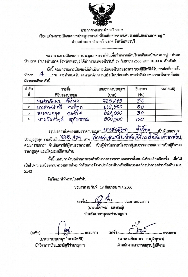 แจ้งผลการเปิดซองการประมูลราคาเช่าที่ดินเพื่อทำตลาดนัดบริเวณสี่แยกบ้านลาด หมู่ที่ 7 ตำบลบ้านลาด