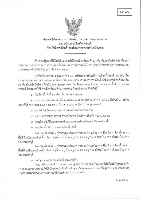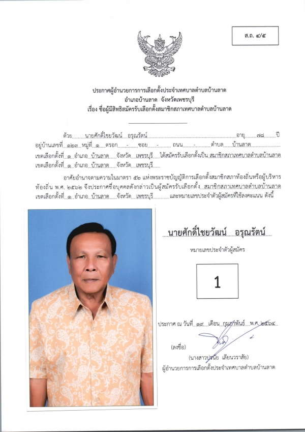 ประกาศรายชื่อผู้มีสิทธิสมัครรับเลือกตั้งสมาชิกสภาเทศบาลตำบลบ้านลาด และนายกเทศมนตรีตำบลบ้านลาด (ส.ถ./ผ.ถ. 4/5)