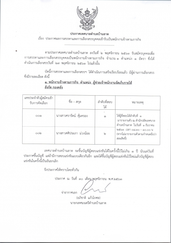 ประกาศผลการสรรหาและการเลือกสรรบุคคลเข้ารับเป็นพนักงานจ้างตามภารกิจ