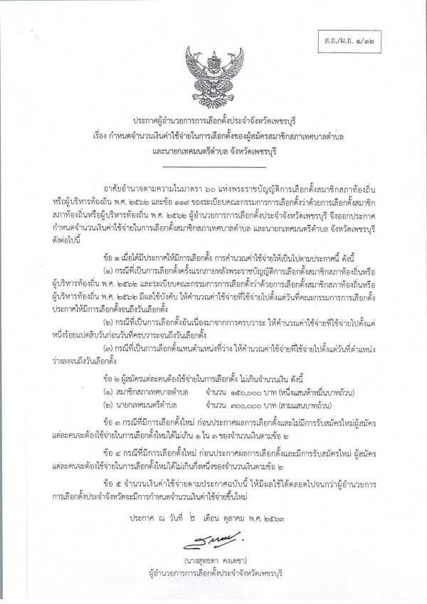 การกำหนดจำนวนเงินค่าใช้จ่ายในการเลือกตั้งของผู้สมัครสมาชิกสภาท้องถิ่นหรือผู้บริหารท้องถิ่น