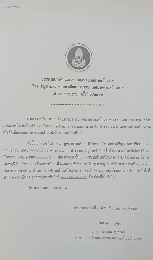 เชิญชวนสมาชิกสภาเด็กและเยาวชนเทศบาลตำบลบ้านลาด เข้าร่วมการประชุมสามัญ ครั้งที่ 3/2562