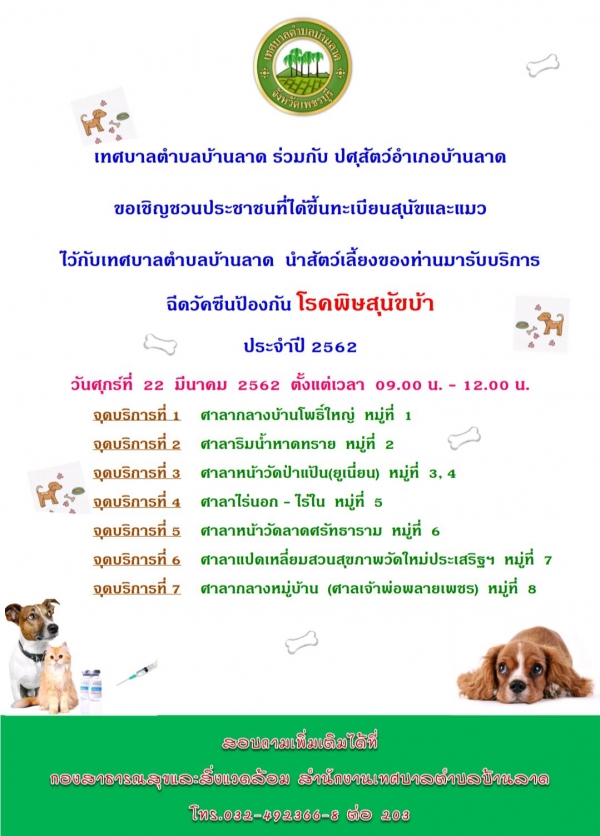 โครงการป้องกันและควบคุมโรคพิษสุนัขบ้าในเขตเทศบาลตำบลบ้านลาด ตามปณิธานสมเด็จพระเจ้าลูกเธอเจ้าฟ้าจุฬาภรณวลัยลักษณ์อัครราชกุมารี ประจำปีงบประมาณ ๒๕๖๒