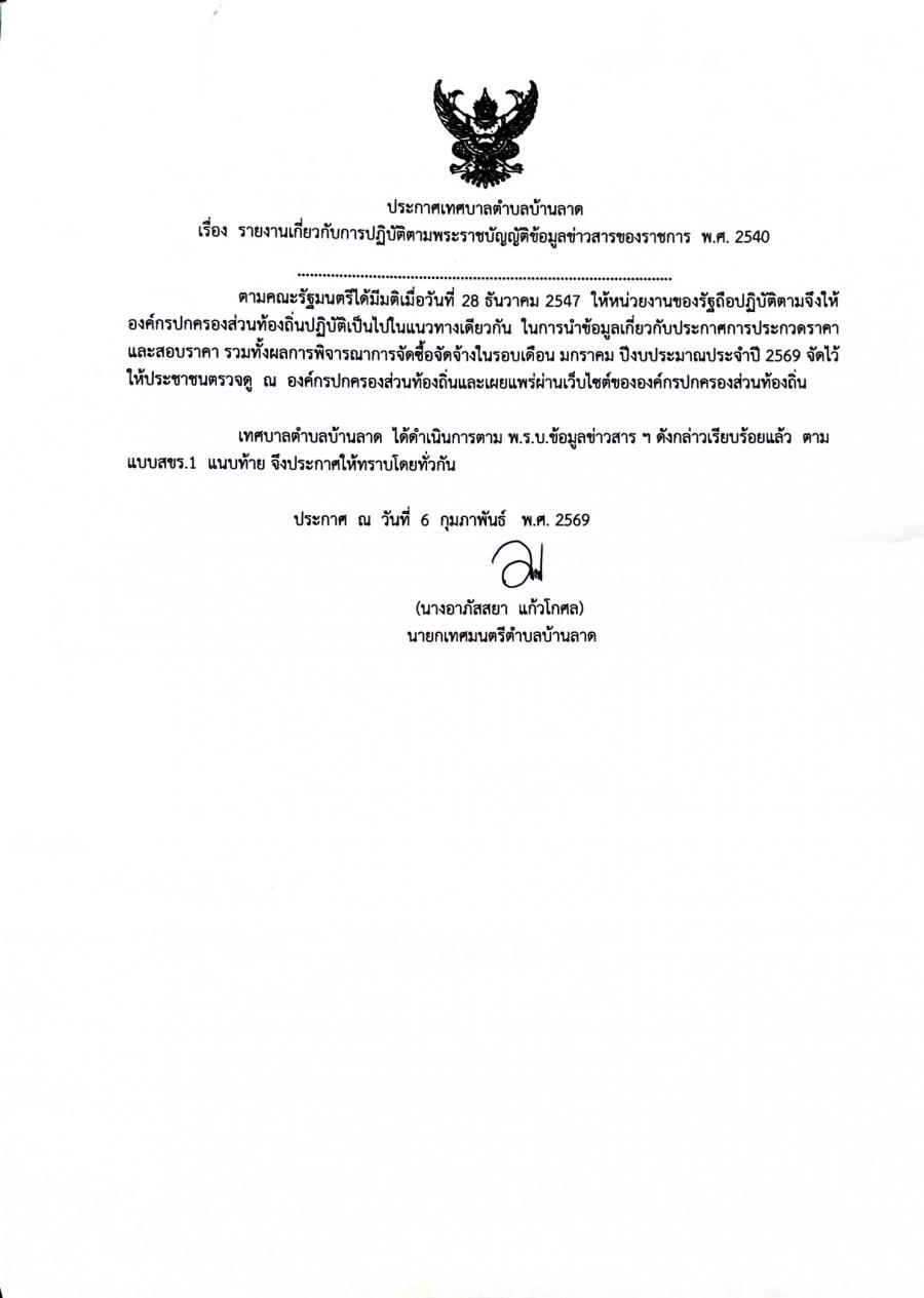 รายงานจัดซื้อจัดจ้างประจำเดือนมกราคม 2569